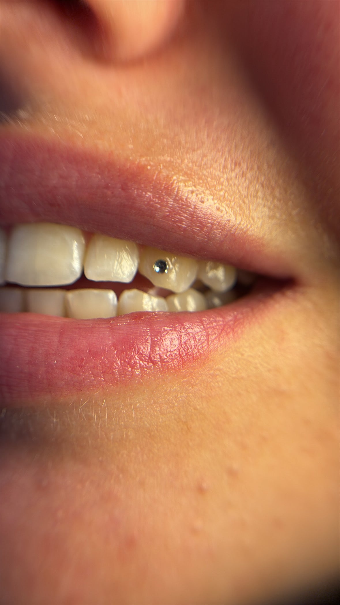 Ik plak een fonkelend kristalletje op je tand voor een stralende glimlach met net dat beetje extra. Je kunt kiezen uit verschillende kleurtjes en maten, van subtiel tot opvallend. Het kristalletje wordt veilig op je tand bevestigd en geeft je glimlach direct een speciaal, glamorous effect.